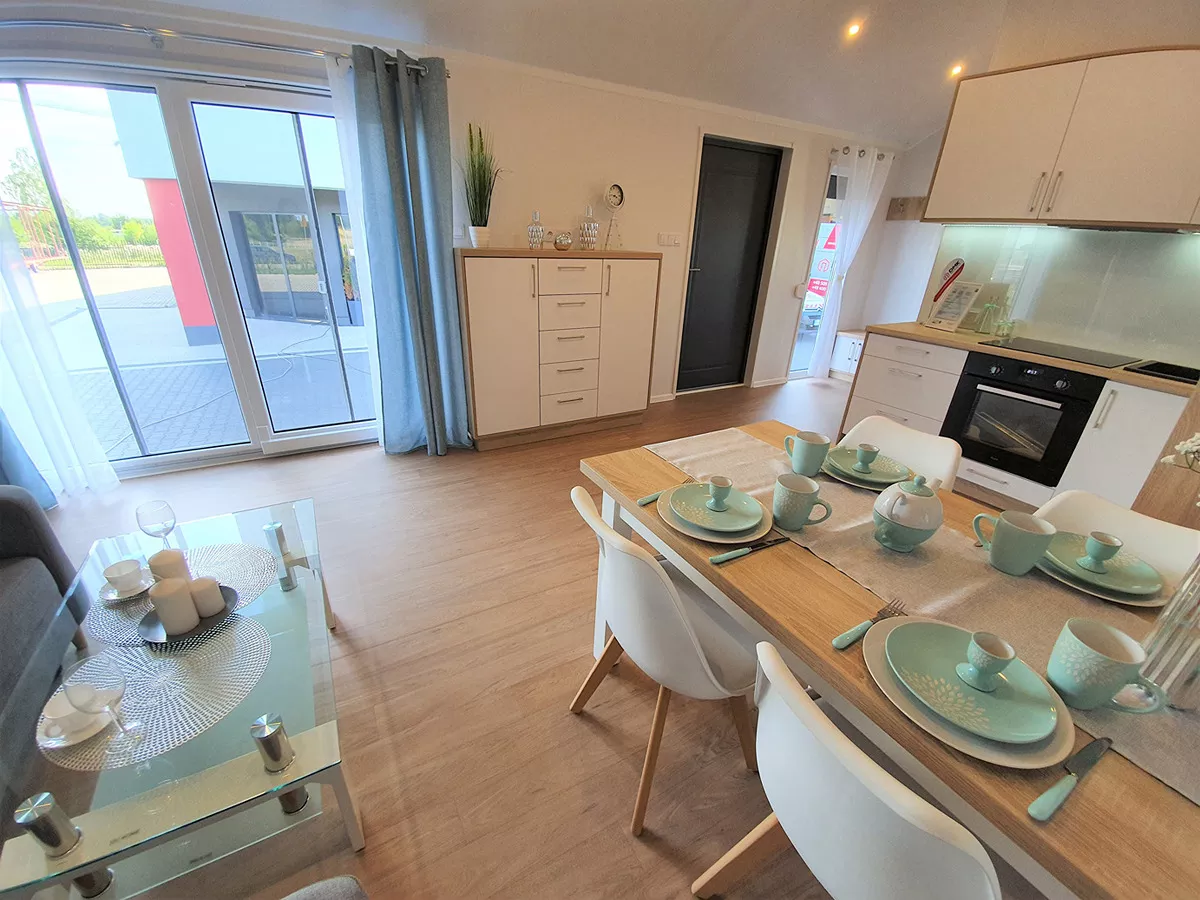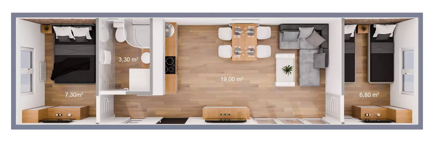 La casa mobile BAHAMA è composta da due camere da letto, un soggiorno, un angolo cottura e un bagno. Dispone quindi di tutti gli ambienti necessari per la vita quotidiana.