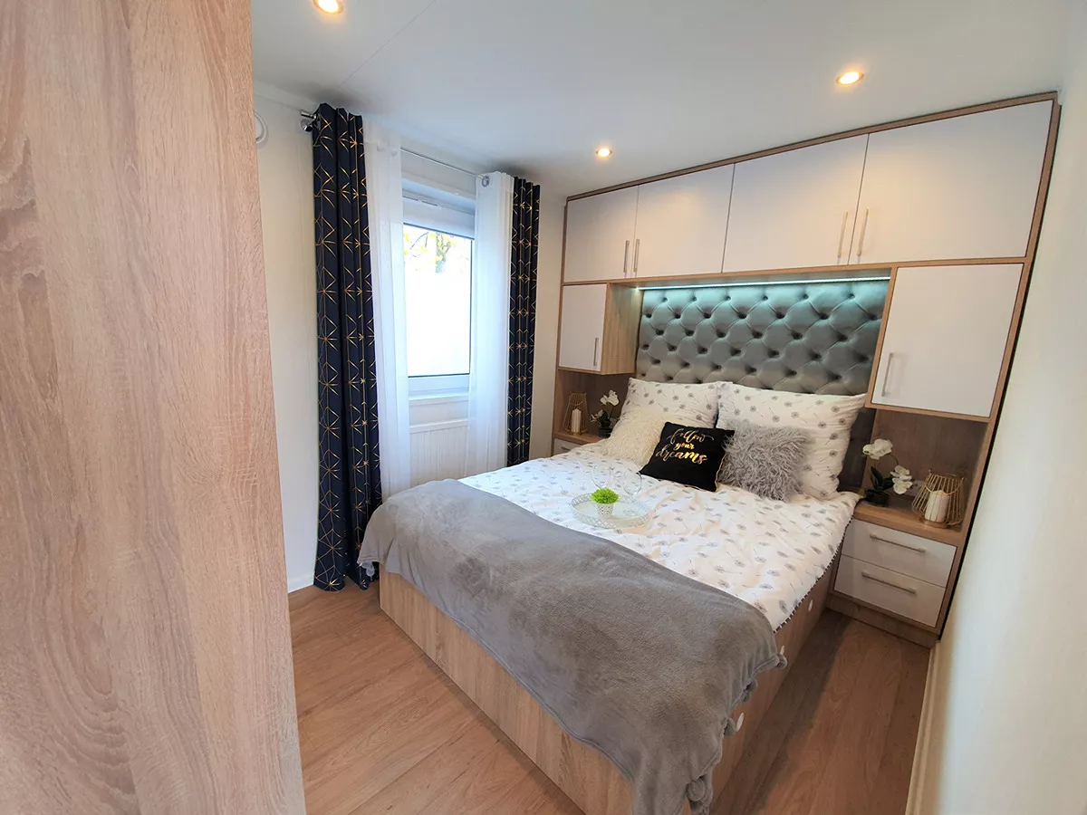 armadio in ogni camera da letto, un comodino in ogni camera da letto, un letto con un materasso e un box per la biancheria da letto in ogni camera da letto, cassettiera in soggiorno, un divano ad angolo con funzione letto e un contenitore per la biancheria da letto, un tavolino da caffè, mobili da cucina inferiori con un piano d’appoggio, pensili da cucina con i LED, lavello con rubinetto in cucina, frigorifero sotto piano d’appoggio, con congelatore, piastra elettrica a 4 fuochi, pannello di vetro sulla parete tra i mobili della cucina, cappa, asciugamani elettrico, wc, box doccia 90 x 90 cm con piatto doccia, lavabo con rubinetto, mobile lavabo, ventilatore in bagno, specchio con illuminazione LED, mobile da bagno con spazio per scaldaacqua e lavatrice, boiler elettrico 50 I, da incasso, piastre riscaldanti elettriche – (1 in ogni camera da letto, 1 in bagno e 2 in soggiorno).