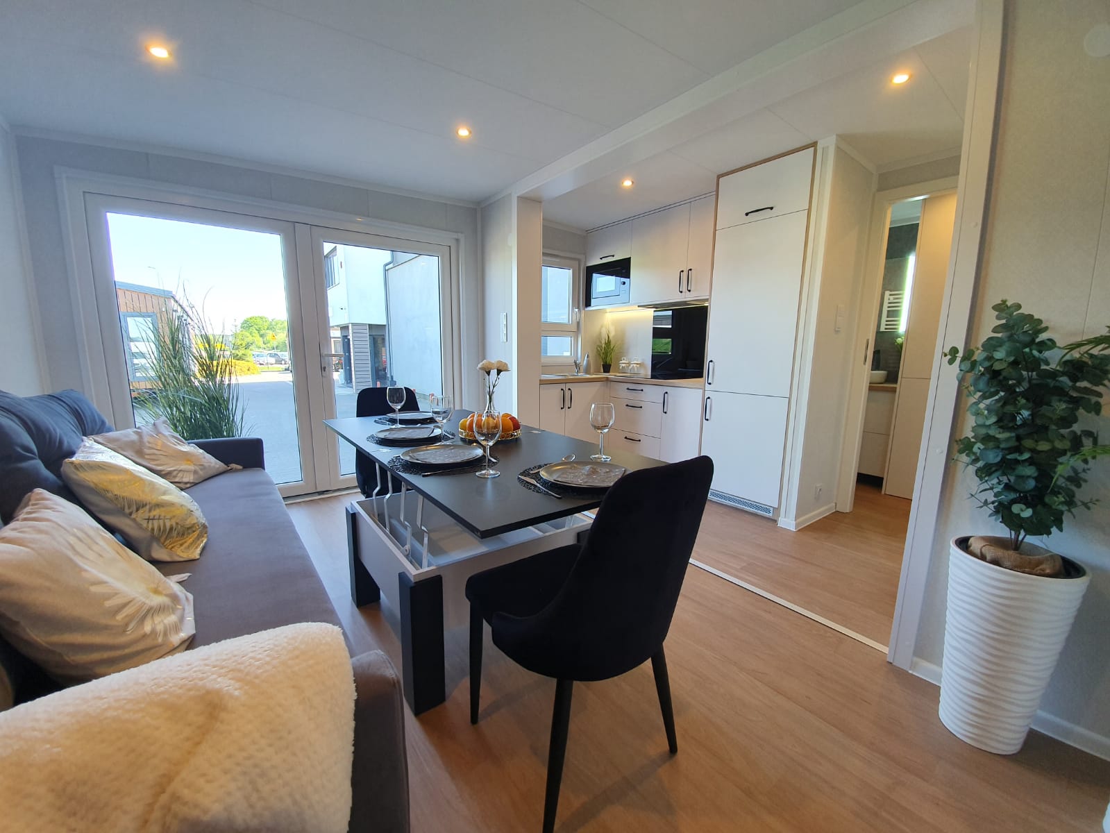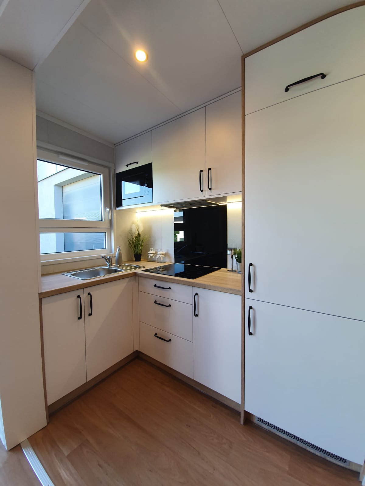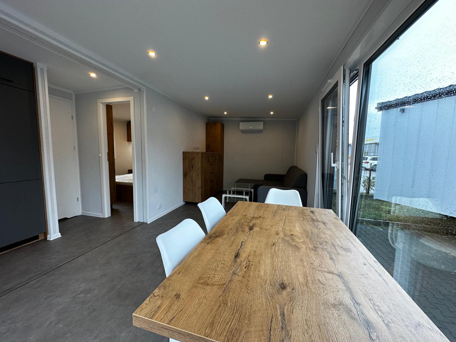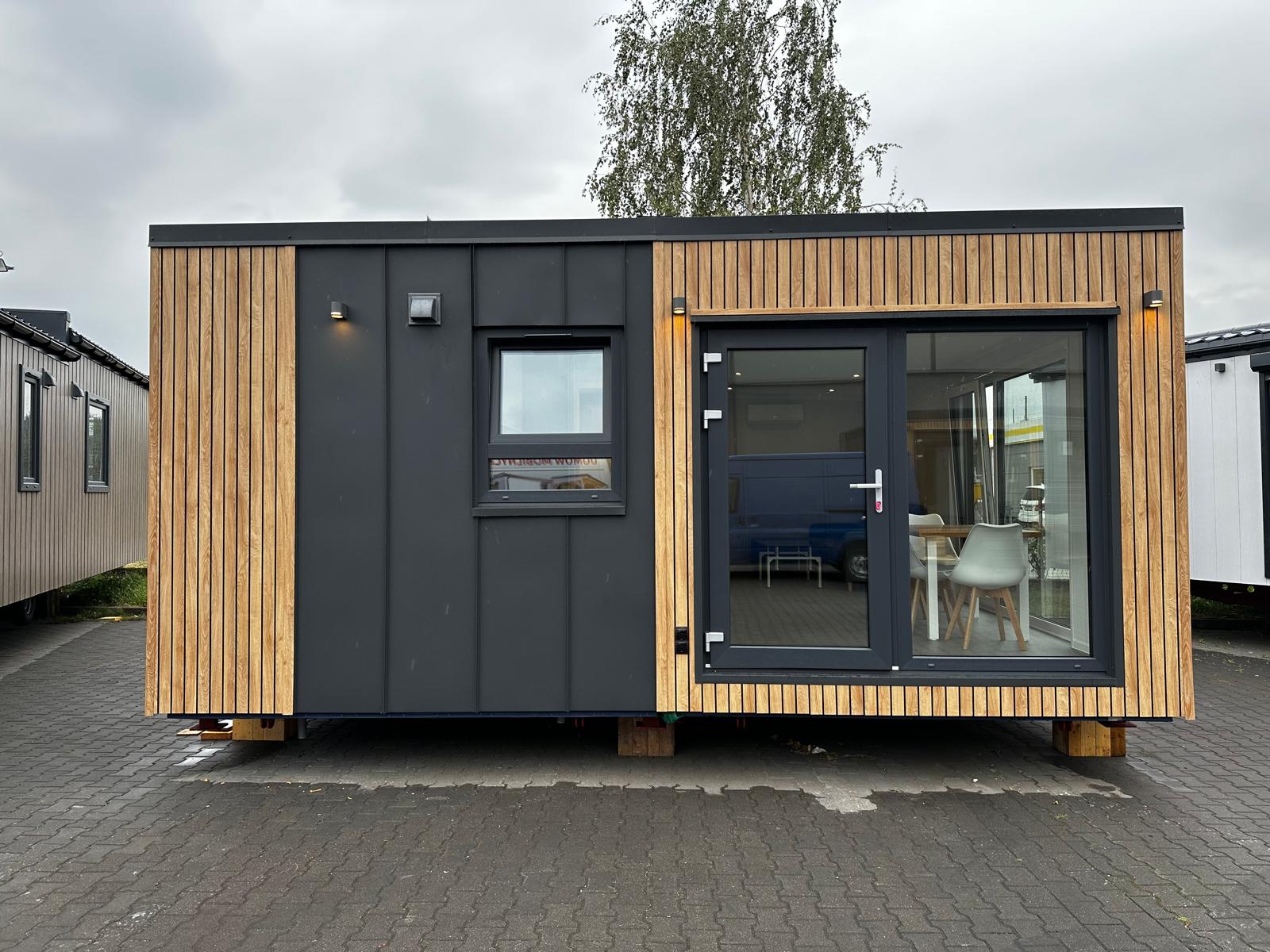 La costruzione in acciaio e legno, ruote complete, gancio di traino per il trasporto, impermeabilizzante, barriera al vapore, barriera antivento, 15 cm di lana minerale nel pavimento e nel sottotetto, 10 cm circa di lana minerale nelle pareti, finestre in pvc a 6 camere con doppi vetri, portefinestre con montante mobile, ventilatori che garantiscono la circolazione dell’aria, davanzali interni in pvc, davanzali esterni in lamiera, telai delle porte regolabili, porte interne in impiallacciato, porta esterna in acciaio con soglia e riempimento fatto di lana di roccia, impianto idraulico, elettrico, di ventilazione completo e l’impianto rtv, interruttori, prese, spine / manometri, coperture in lamiera d’acciaio, grondaie in pvc, pavimento rifinito con rivestimento in lvt resistente all’abrasione, ventilazione meccanica in bagno e cucina, l’interno è rifinito con pannelli e listelli in PVC, la facciata esterna è realizzata con il pannello VinyTOP, illuminazione interna a LED, illuminazione da esterno a LED (da 6 a 10 punti luce), prese rtv con cavo antenna portato all’esterno della casa, il fondo della casa è protetto con una lamiera di acciaio zincato