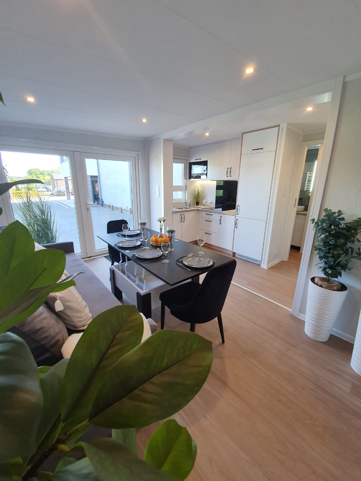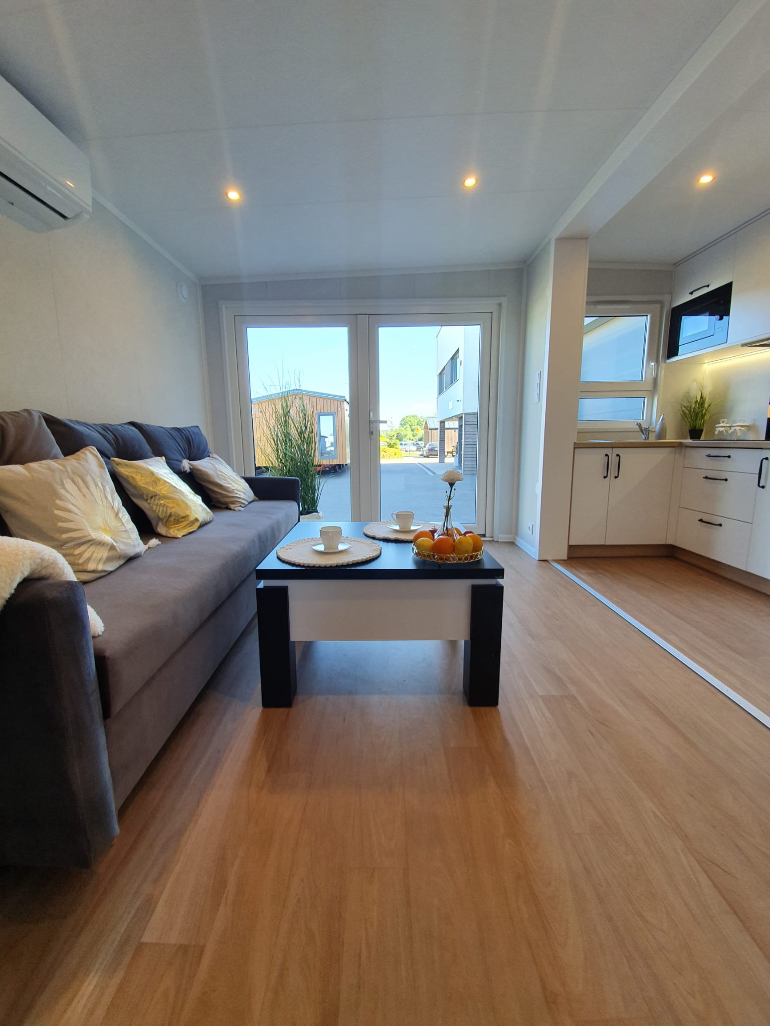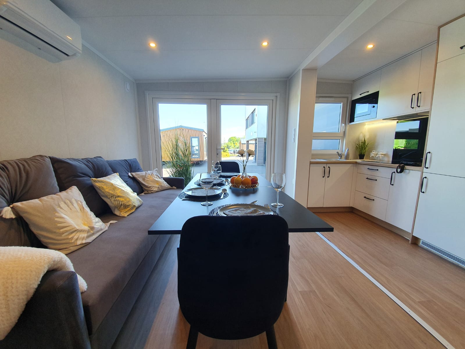 La costruzione in acciaio e legno, ruote complete, gancio di traino per il trasporto, impermeabilizzante, barriera al vapore, barriera antivento, 15 cm di lana minerale nel pavimento e nel sottotetto, 10 cm circa di lana minerale nelle pareti, finestre in pvc a 6 camere con doppi vetri, portefinestre con montante mobile, ventilatori che garantiscono la circolazione dell’aria, davanzali interni in pvc, davanzali esterni in lamiera, telai delle porte regolabili, porte interne in impiallacciato, porta esterna in acciaio con soglia e riempimento fatto di lana di roccia, impianto idraulico, elettrico, di ventilazione completo e l’impianto rtv, interruttori, prese, spine / manometri, coperture in lamiera d’acciaio, grondaie in pvc, pavimento rifinito con rivestimento in lvt resistente all’abrasione, ventilazione meccanica in bagno e cucina, l’interno è rifinito con pannelli e listelli in PVC, la facciata esterna è realizzata con il pannello VinyTOP, illuminazione interna a LED, illuminazione da esterno a LED (da 6 a 10 punti luce), prese rtv con cavo antenna portato all’esterno della casa, il fondo della casa è protetto con una lamiera di acciaio zincato