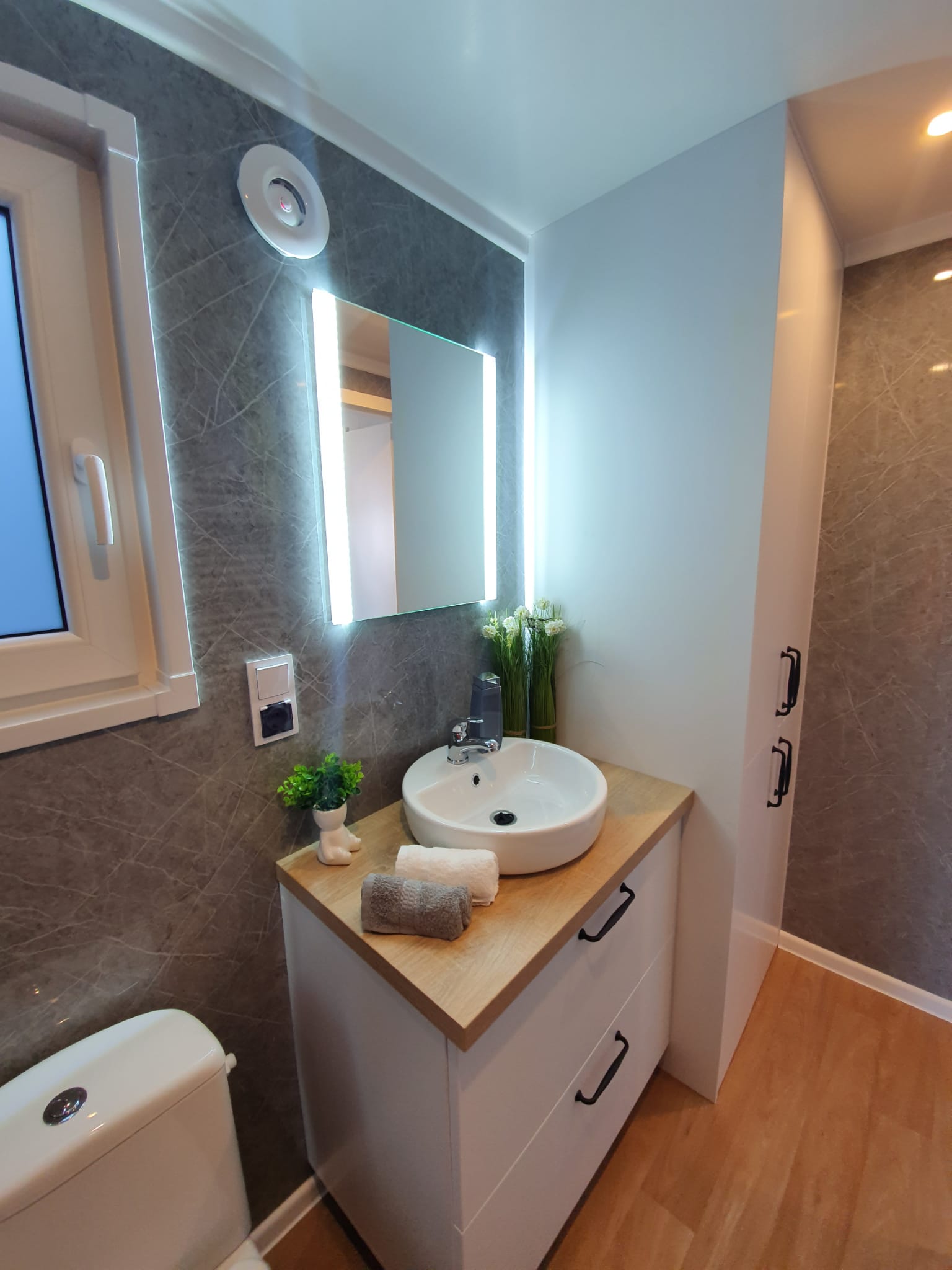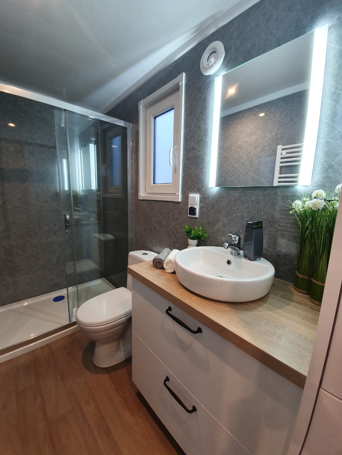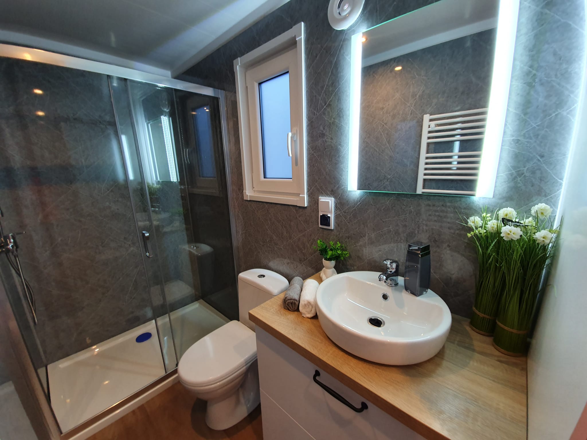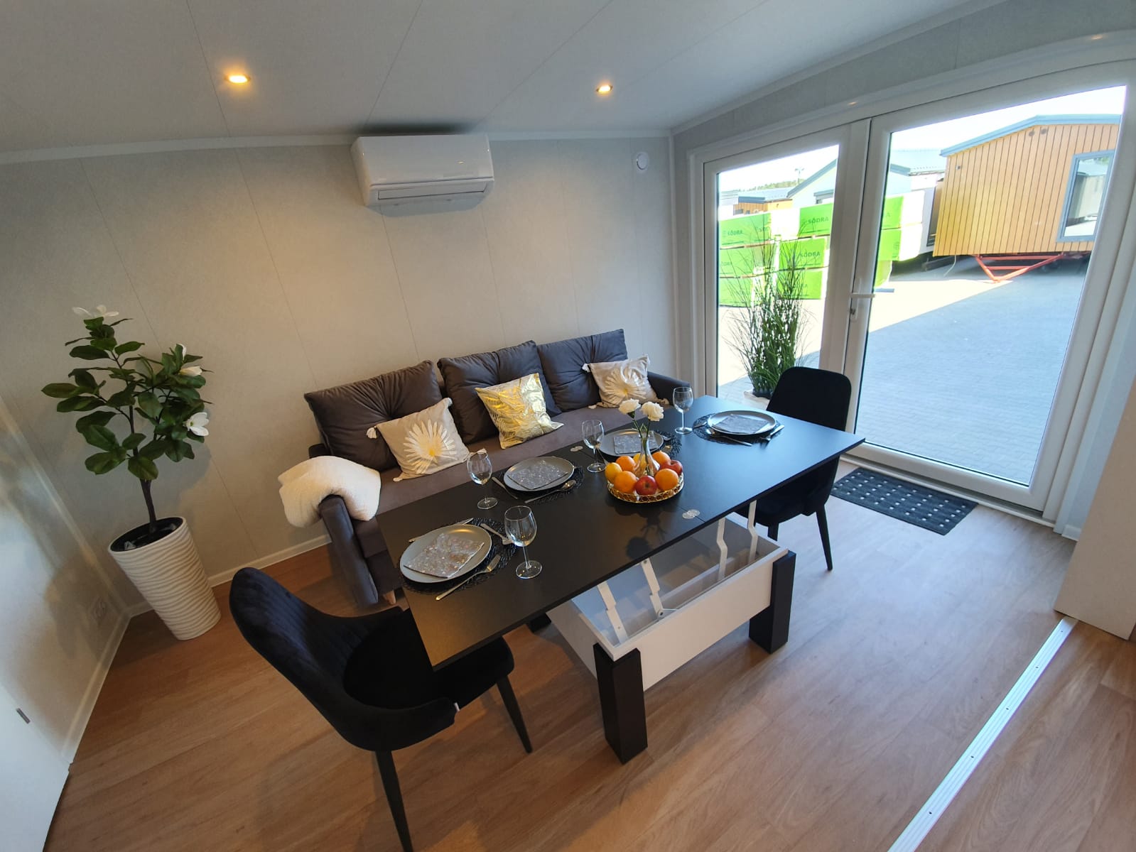 La costruzione in acciaio e legno, ruote complete, gancio di traino per il trasporto, impermeabilizzante, barriera al vapore, barriera antivento, 15 cm di lana minerale nel pavimento e nel sottotetto, 10 cm circa di lana minerale nelle pareti, finestre in pvc a 6 camere con doppi vetri, portefinestre con montante mobile, ventilatori che garantiscono la circolazione dell’aria, davanzali interni in pvc, davanzali esterni in lamiera, telai delle porte regolabili, porte interne in impiallacciato, porta esterna in acciaio con soglia e riempimento fatto di lana di roccia, impianto idraulico, elettrico, di ventilazione completo e l’impianto rtv, interruttori, prese, spine / manometri, coperture in lamiera d’acciaio, grondaie in pvc, pavimento rifinito con rivestimento in lvt resistente all’abrasione, ventilazione meccanica in bagno e cucina, l’interno è rifinito con pannelli e listelli in PVC, la facciata esterna è realizzata con il pannello VinyTOP, illuminazione interna a LED, illuminazione da esterno a LED (da 6 a 10 punti luce), prese rtv con cavo antenna portato all’esterno della casa, il fondo della casa è protetto con una lamiera di acciaio zincato