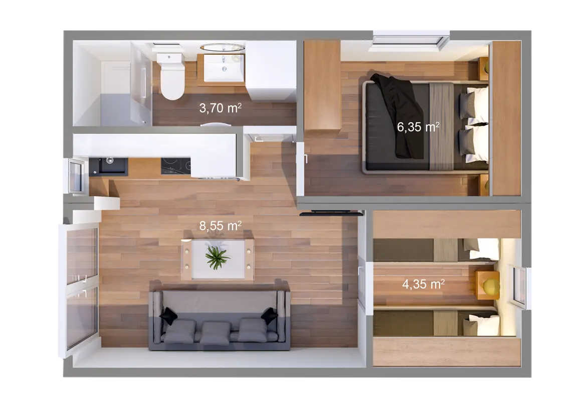 BALATON XL E’ COMPOSTA DA UNA CAMERA DA LETTO, SOGGIORNO – CUCINA, UNA CAMERETTA (OPTIONAL) E UN BAGNO