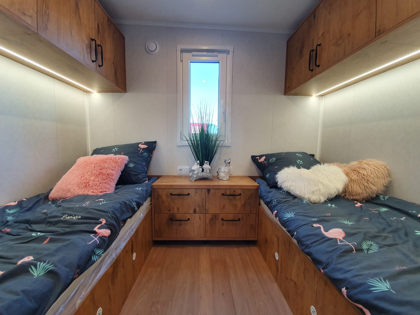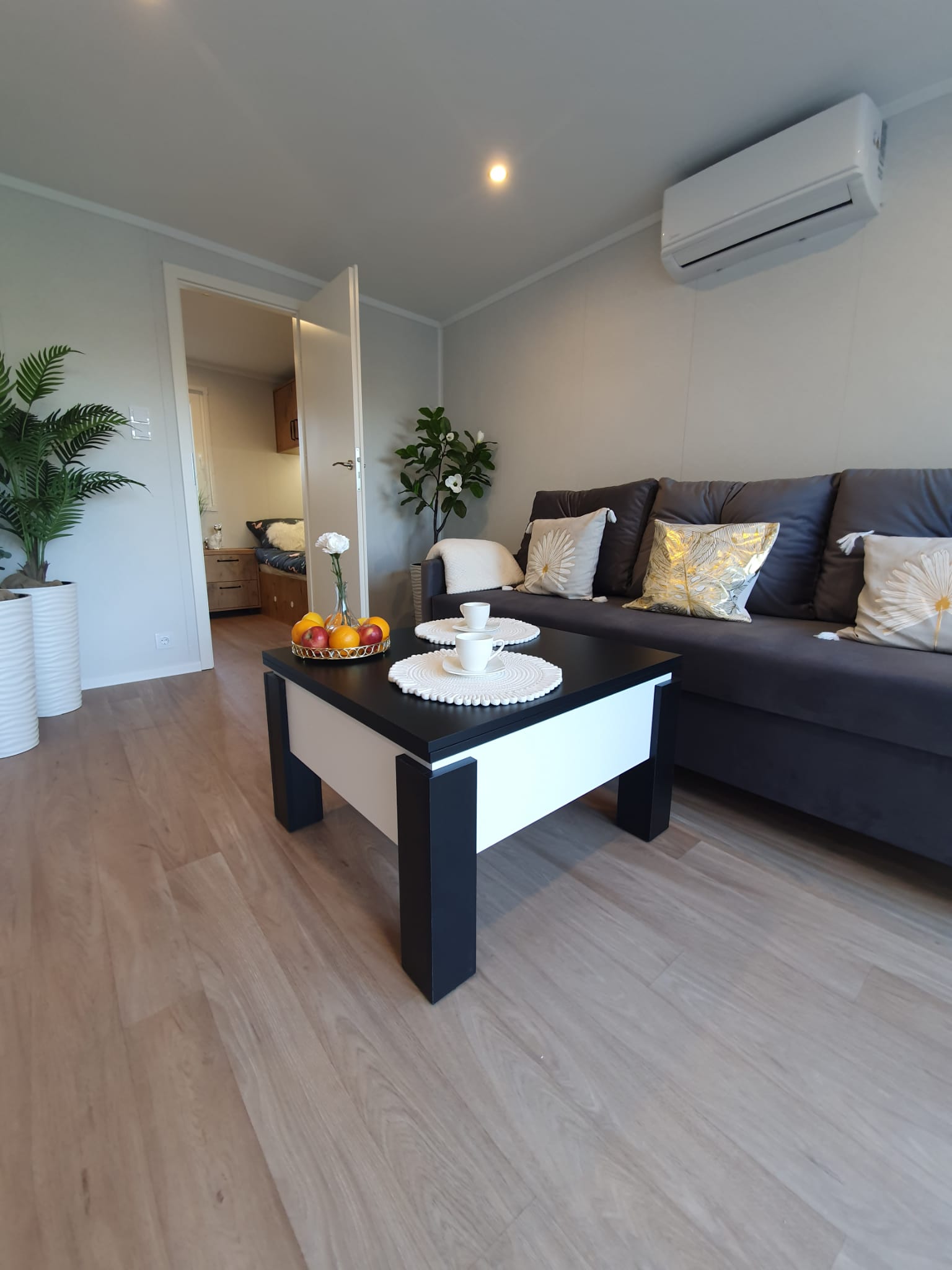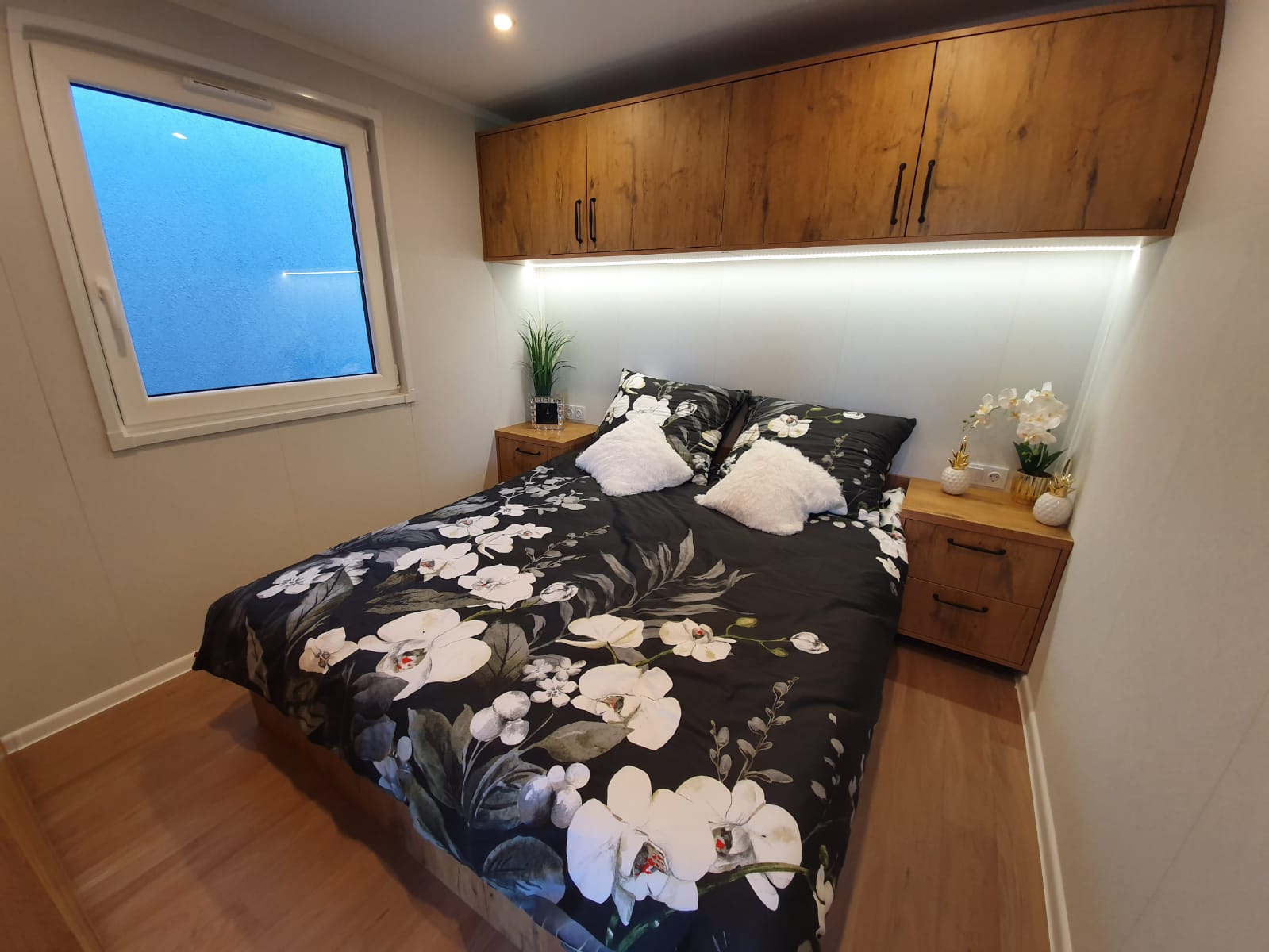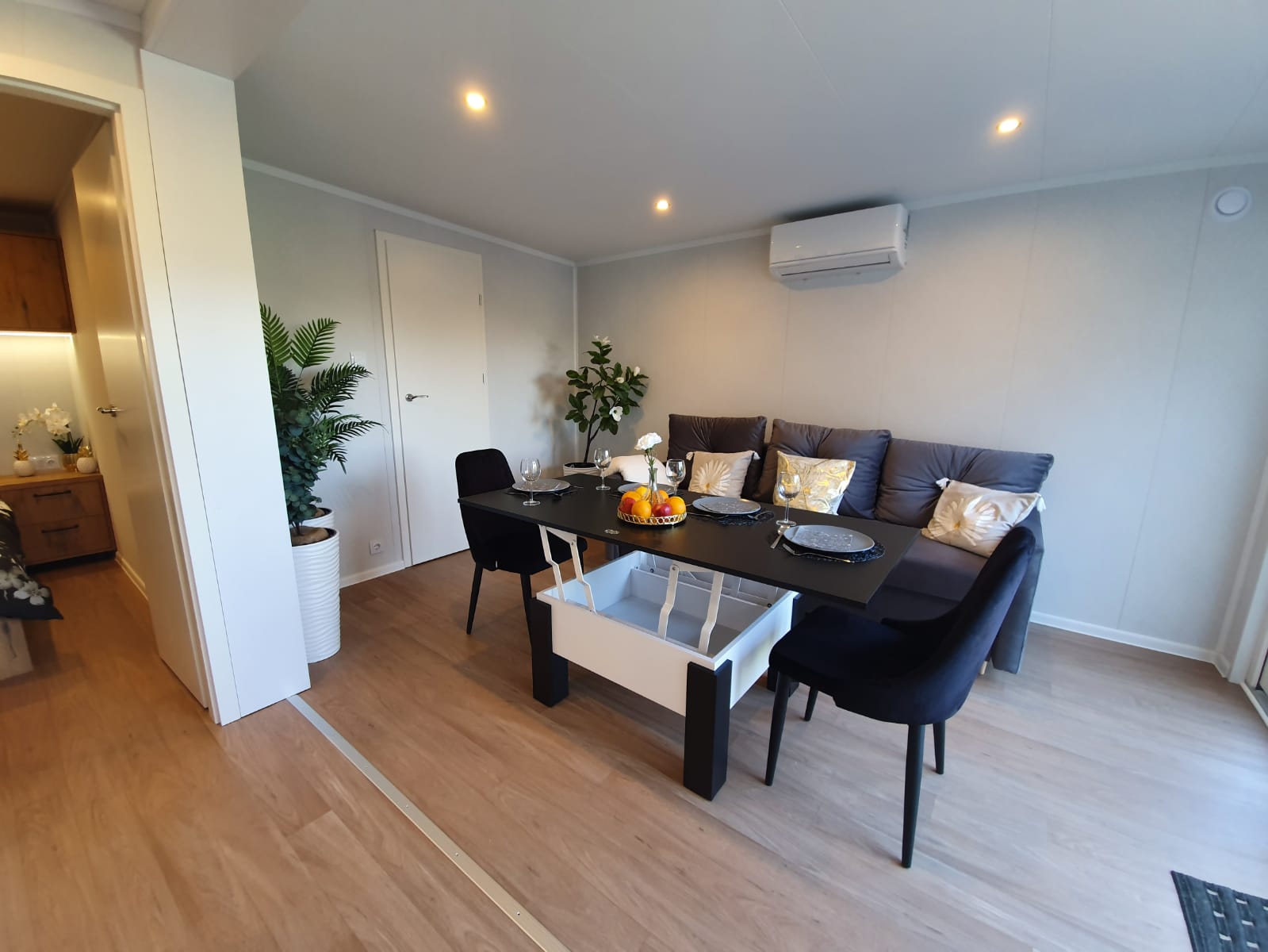 armadio in ogni camera da letto, un comodino in ogni camera da letto, un letto con un materasso e un box per la biancheria da letto in ogni camera da letto, cassettiera in soggiorno, un divano ad angolo con funzione letto e un contenitore per la biancheria da letto, un tavolino da caffè, mobili da cucina inferiori con un piano d’appoggio, pensili da cucina con i LED, lavello con rubinetto in cucina, frigorifero sotto piano d’appoggio, con congelatore, piastra elettrica a 4 fuochi, pannello di vetro sulla parete tra i mobili della cucina, cappa, asciugamani elettrico, wc, box doccia 90 x 90 cm con piatto doccia, lavabo con rubinetto, mobile lavabo, ventilatore in bagno, specchio con illuminazione LED, mobile da bagno con spazio per scaldaacqua e lavatrice, boiler elettrico 50 I, da incasso, piastre riscaldanti elettriche – (1 in ogni camera da letto, 1 in bagno e 2 in soggiorno).