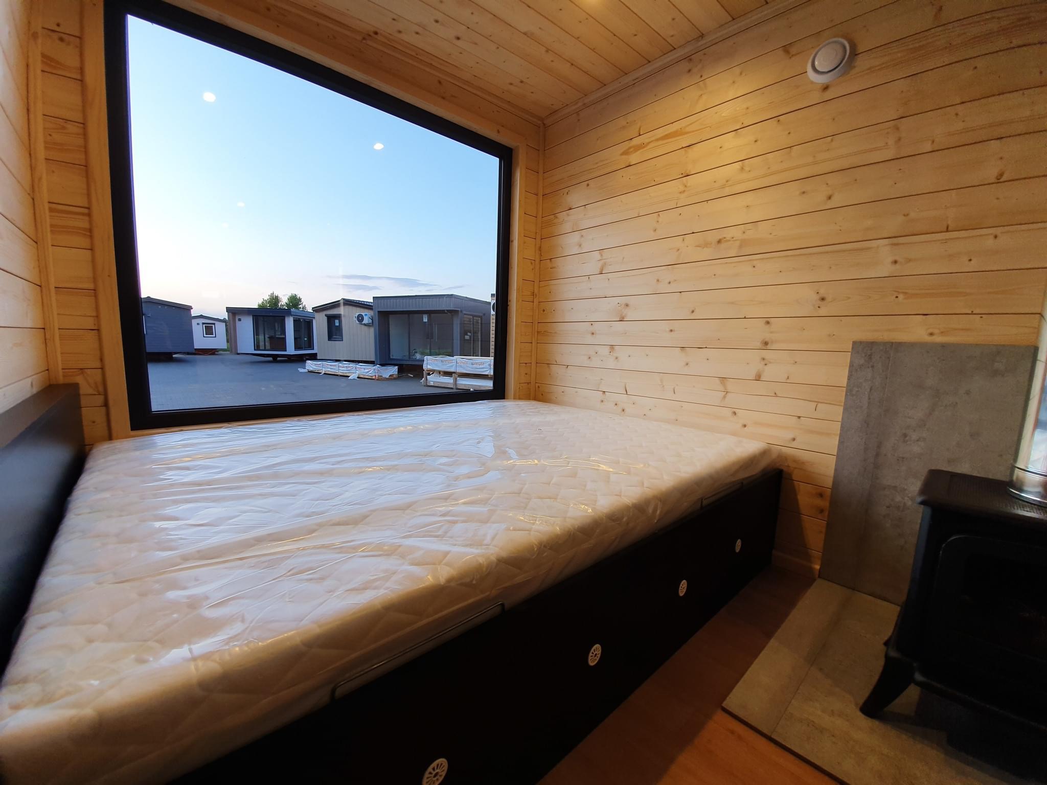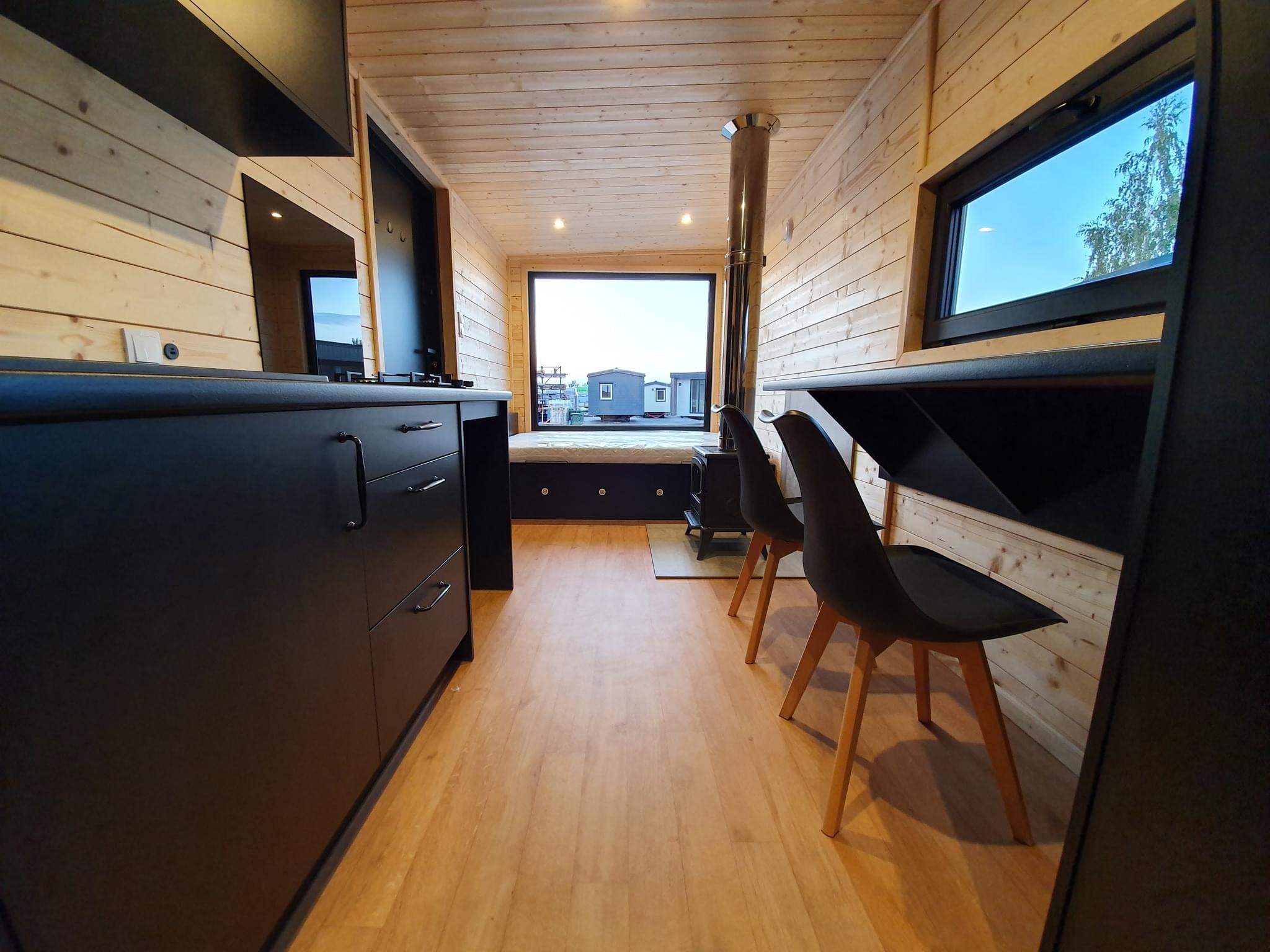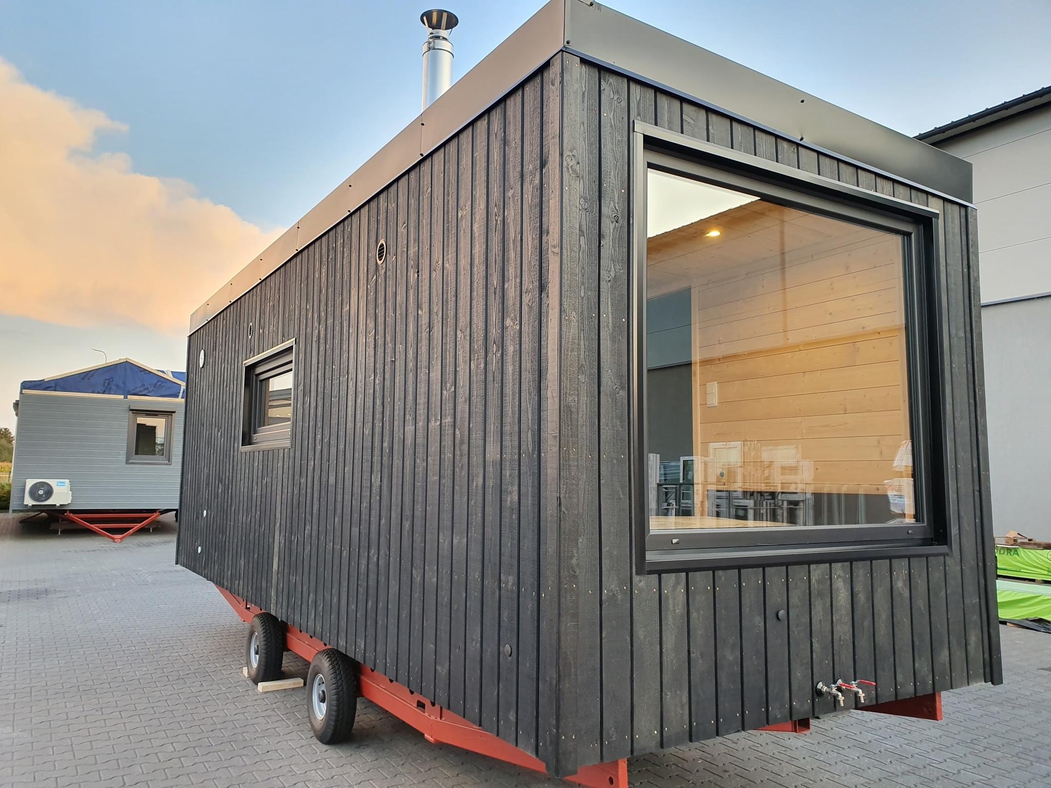 La costruzione in acciaio e legno, ruote complete, gancio di traino per il trasporto, impermeabilizzante, barriera al vapore, barriera antivento, 15 cm di lana minerale nel pavimento e nel sottotetto, 10 cm circa di lana minerale nelle pareti, finestre in pvc a 6 camere con doppi vetri, portefinestre con montante mobile, ventilatori che garantiscono la circolazione dell’aria, davanzali interni in pvc, davanzali esterni in lamiera, telai delle porte regolabili, porte interne in impiallacciato, porta esterna in acciaio con soglia e riempimento fatto di lana di roccia, impianto idraulico, elettrico, di ventilazione completo e l’impianto rtv, interruttori, prese, spine / manometri, coperture in lamiera d’acciaio, grondaie in pvc, pavimento rifinito con rivestimento in lvt resistente all’abrasione, ventilazione meccanica in bagno e cucina, l’interno è rifinito con pannelli e listelli in PVC, la facciata esterna è realizzata con il pannello VinyTOP, illuminazione interna a LED, illuminazione da esterno a LED (da 6 a 10 punti luce), prese rtv con cavo antenna portato all’esterno della casa, il fondo della casa è protetto con una lamiera di acciaio zincato