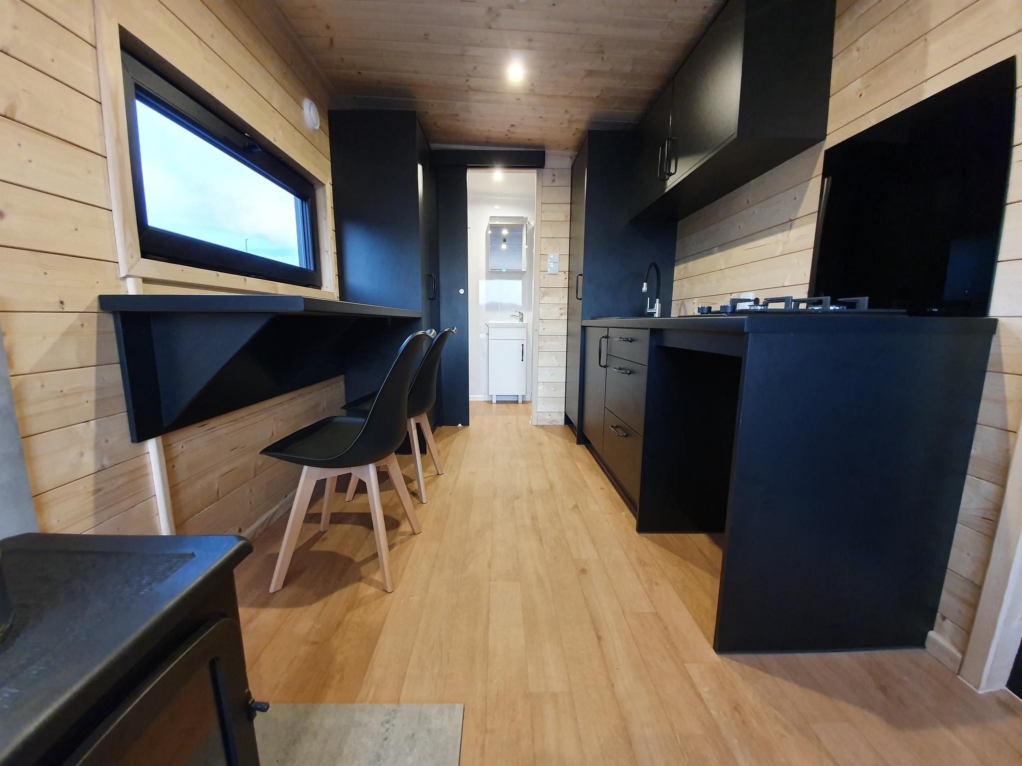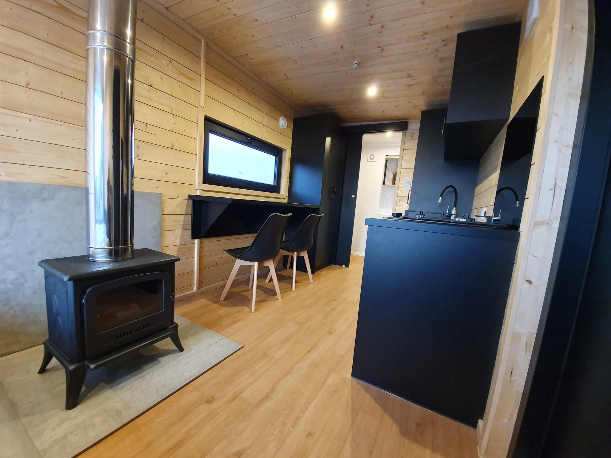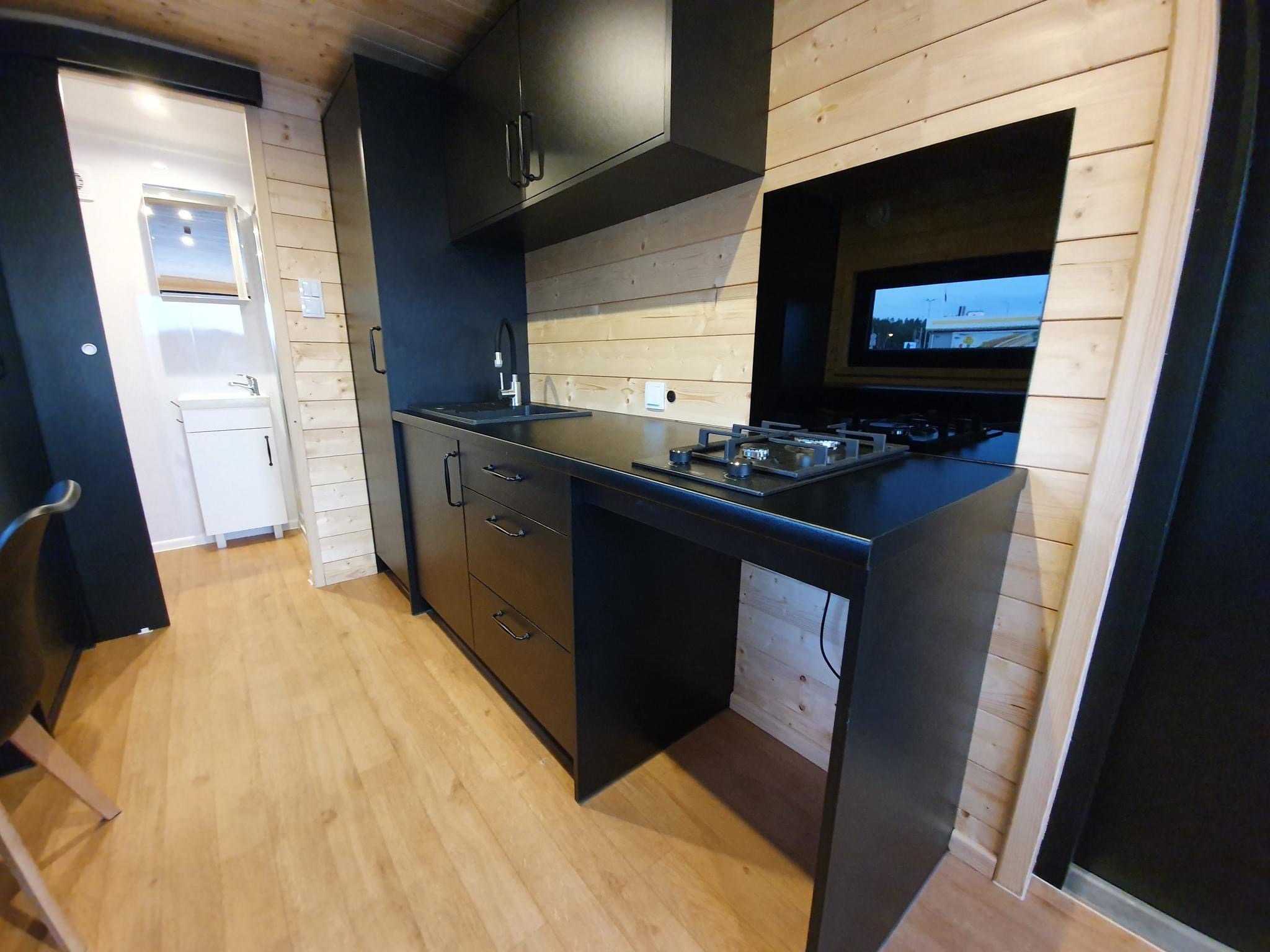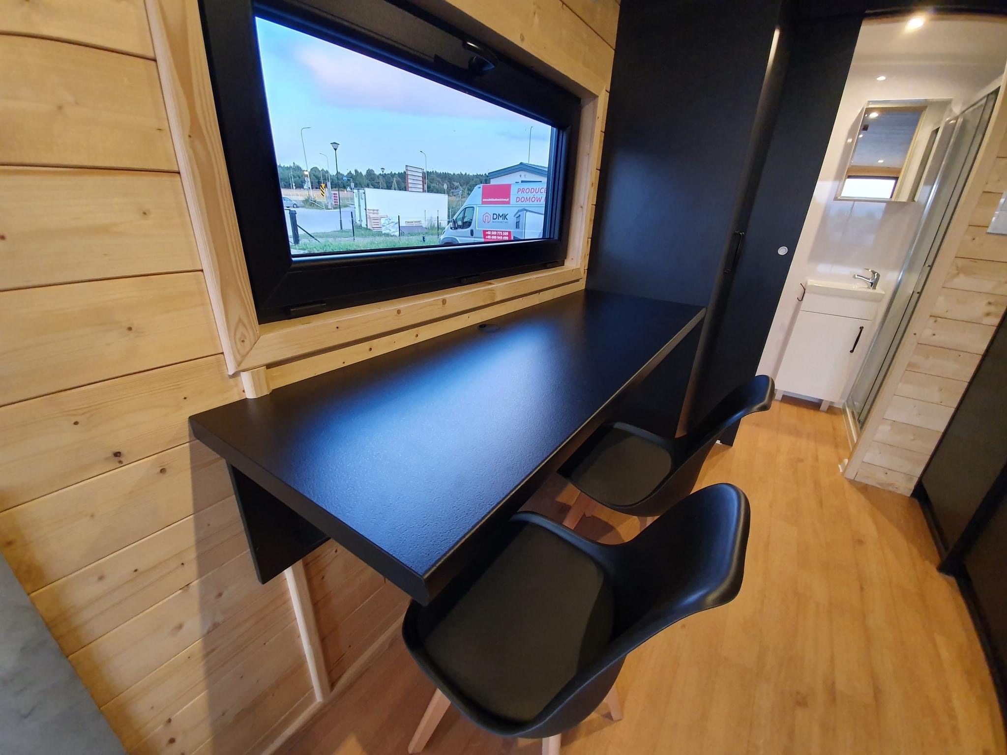 La costruzione in acciaio e legno, ruote complete, gancio di traino per il trasporto, impermeabilizzante, barriera al vapore, barriera antivento, 15 cm di lana minerale nel pavimento e nel sottotetto, 10 cm circa di lana minerale nelle pareti, finestre in pvc a 6 camere con doppi vetri, portefinestre con montante mobile, ventilatori che garantiscono la circolazione dell’aria, davanzali interni in pvc, davanzali esterni in lamiera, telai delle porte regolabili, porte interne in impiallacciato, porta esterna in acciaio con soglia e riempimento fatto di lana di roccia, impianto idraulico, elettrico, di ventilazione completo e l’impianto rtv, interruttori, prese, spine / manometri, coperture in lamiera d’acciaio, grondaie in pvc, pavimento rifinito con rivestimento in lvt resistente all’abrasione, ventilazione meccanica in bagno e cucina, l’interno è rifinito con pannelli e listelli in PVC, la facciata esterna è realizzata con il pannello VinyTOP, illuminazione interna a LED, illuminazione da esterno a LED (da 6 a 10 punti luce), prese rtv con cavo antenna portato all’esterno della casa, il fondo della casa è protetto con una lamiera di acciaio zincato