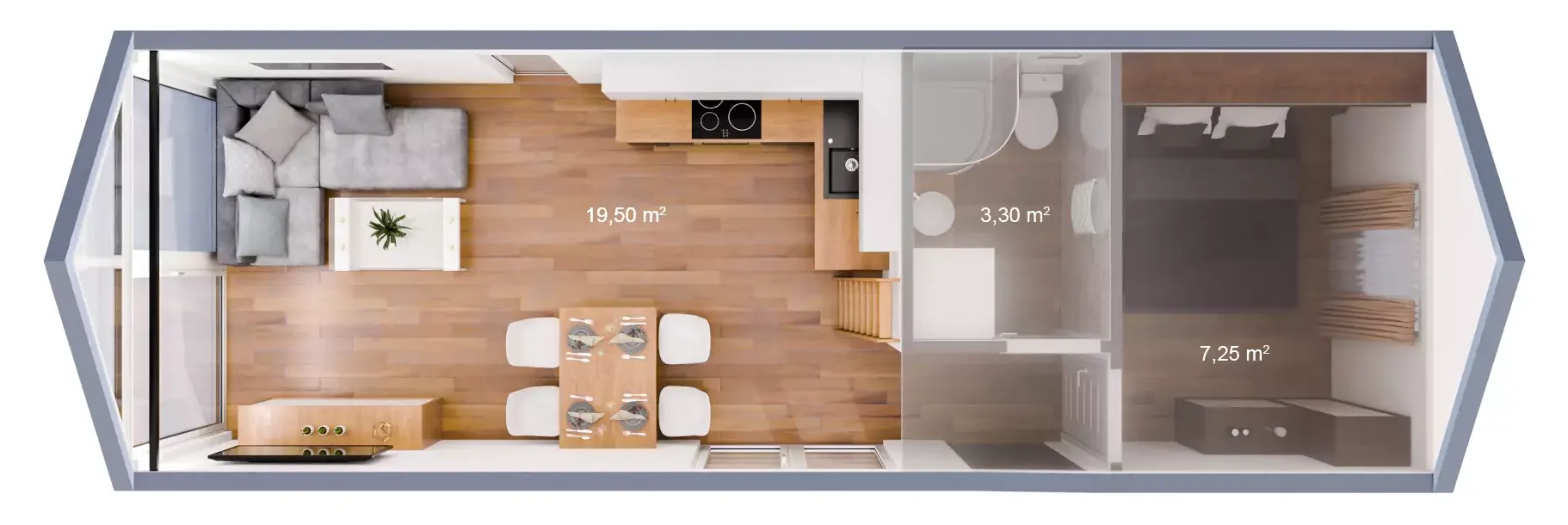 BAHAMA 12m x 3,5m La casa mobile BAHAMA è composta da due camere da letto, un soggiorno, un angolo cottura e un bagno. Dispone quindi
