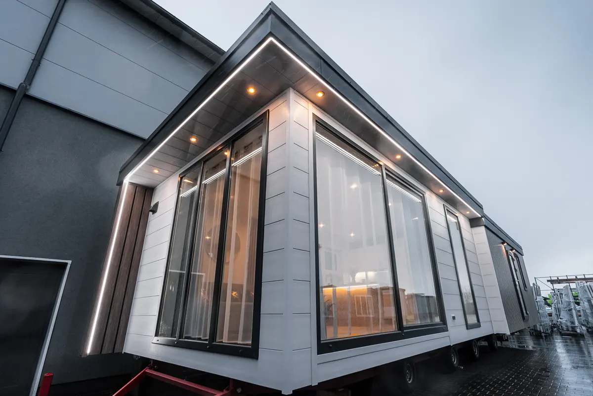 La costruzione in acciaio e legno, ruote complete, gancio di traino per il trasporto, impermeabilizzante, barriera al vapore, barriera antivento, 15 cm di lana minerale nel pavimento e nel sottotetto, 10 cm circa di lana minerale nelle pareti, finestre in pvc a 6 camere con doppi vetri, portefinestre con montante mobile, ventilatori che garantiscono la circolazione dell’aria, davanzali interni in pvc, davanzali esterni in lamiera, telai delle porte regolabili, porte interne in impiallacciato, porta esterna in acciaio con soglia e riempimento fatto di lana di roccia, impianto idraulico, elettrico, di ventilazione completo e l’impianto rtv, interruttori, prese, spine / manometri, coperture in lamiera d’acciaio, grondaie in pvc, pavimento rifinito con rivestimento in lvt resistente all’abrasione, ventilazione meccanica in bagno e cucina, l’interno è rifinito con pannelli e listelli in PVC, la facciata esterna è realizzata con il pannello VinyTOP, illuminazione interna a LED, illuminazione da esterno a LED (da 6 a 10 punti luce), prese rtv con cavo antenna portato all’esterno della casa, il fondo della casa è protetto con una lamiera di acciaio zincato