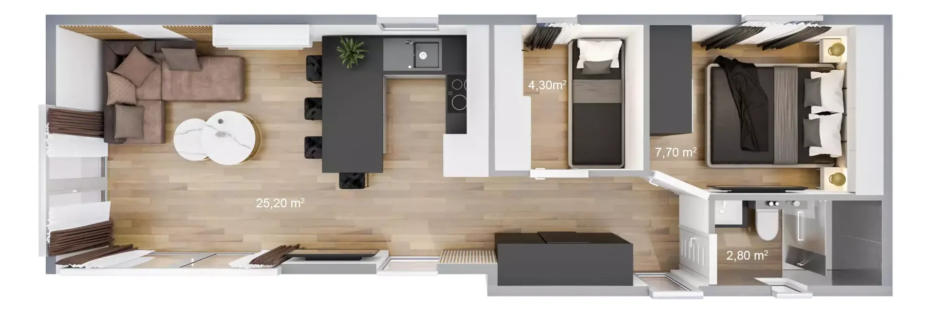 ROYAL, di cui stiamo parlando, è una casa mobile con una superficie di quasi 48 m². Al suo interno troveremo due camere da letto, un bagno e un ampio soggiorno con angolo cottura.