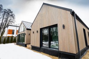 Realizzazione del progetto H 172, personalizzato esternamente con i rivestimenti in wpc effetto legno & lamiera nera.